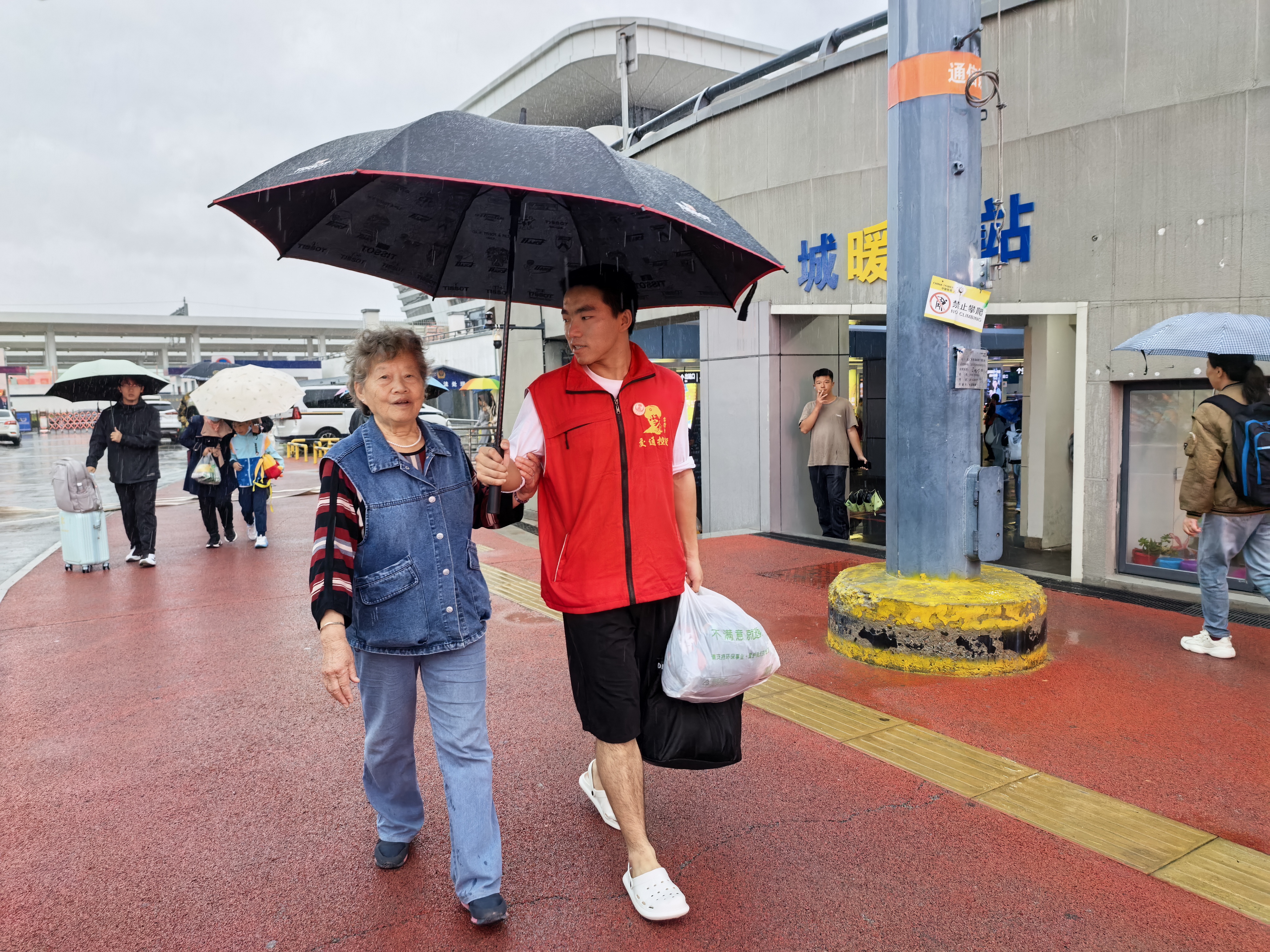 “小伙子,你鞋都濕透了,快歇歇吧!”一位提著兩大袋行李的旅客看著志愿者邵俊翔鞋子上的雨水,忍不住拉了拉他的胳膊。小邵卻笑著把行李往自己肩上又挪了挪:“沒事阿姨,你要去的公交換乘點(diǎn)不遠(yuǎn),我送您過去?!闭f著就打起傘快步往換乘點(diǎn)走去,雨水順著傘沿留下,打濕了他的衣褲,卻沒停下腳步。另一邊,志愿者們正幫助旅客搬運(yùn)大件行李,用手推車將他們送到換乘點(diǎn)。