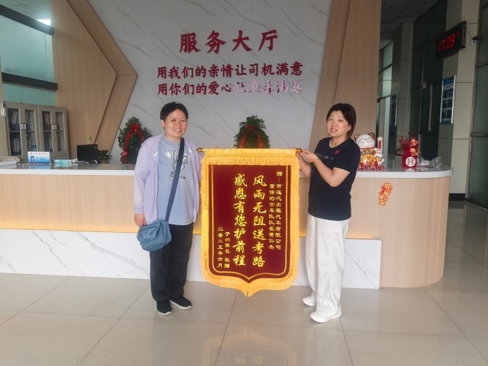 家住海州區(qū)華聯(lián)附近的市民徐女士,更是特意制作了一面寫有“風(fēng)雨無阻送考路,感恩有您護(hù)前程”的錦旗,親自送到汽服公司出租汽車事業(yè)部,以此表達(dá)對(duì)“雷鋒的士”車隊(duì)隊(duì)長黃仁杰師傅的深深謝意。徐女士回憶道,她是通過蒼梧晚報(bào)看到了愛心送考服務(wù)的廣告,抱著試試看的心態(tài)為二兒子小于報(bào)名了一對(duì)一點(diǎn)對(duì)點(diǎn)送考服務(wù)。沒想到,對(duì)接的黃仁杰師傅讓她十分感動(dòng)。黃師傅提前兩天就與她仔細(xì)對(duì)接送考路線,反復(fù)確認(rèn)每一個(gè)細(xì)節(jié),確保萬無一失。送考的三天里,黃師傅每次都提前到達(dá)約定地點(diǎn),車內(nèi)干凈整潔,一塵不染。高考期間天氣炎熱,黃師傅不僅準(zhǔn)時(shí)出現(xiàn)在考場外,還貼心地為考生準(zhǔn)備了礦泉水,讓徐女士一家感激不已。