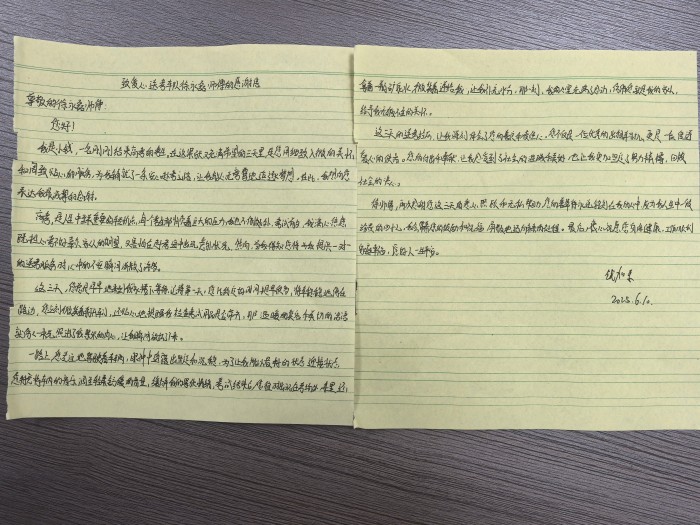 家住海州區(qū)萬象新海苑的小錢同學(xué),也特意寫來了一封飽含深情的感謝信。在信中,他真誠地感謝為他提供3天送考服務(wù)的徐永磊師傅。小錢說,在這緊張又充滿希望的三天里,徐師傅就像一位貼心的守護(hù)者,用細(xì)致入微的關(guān)懷和周到貼心的服務(wù),為他驅(qū)散了心中的緊張與不安,讓他能夠心無旁騖地追逐夢想。徐師傅的付出和奉獻(xiàn),讓他真切地感受到了社會(huì)的溫暖和美好,也讓他更加堅(jiān)定了努力拼搏、回報(bào)社會(huì)的決心。
