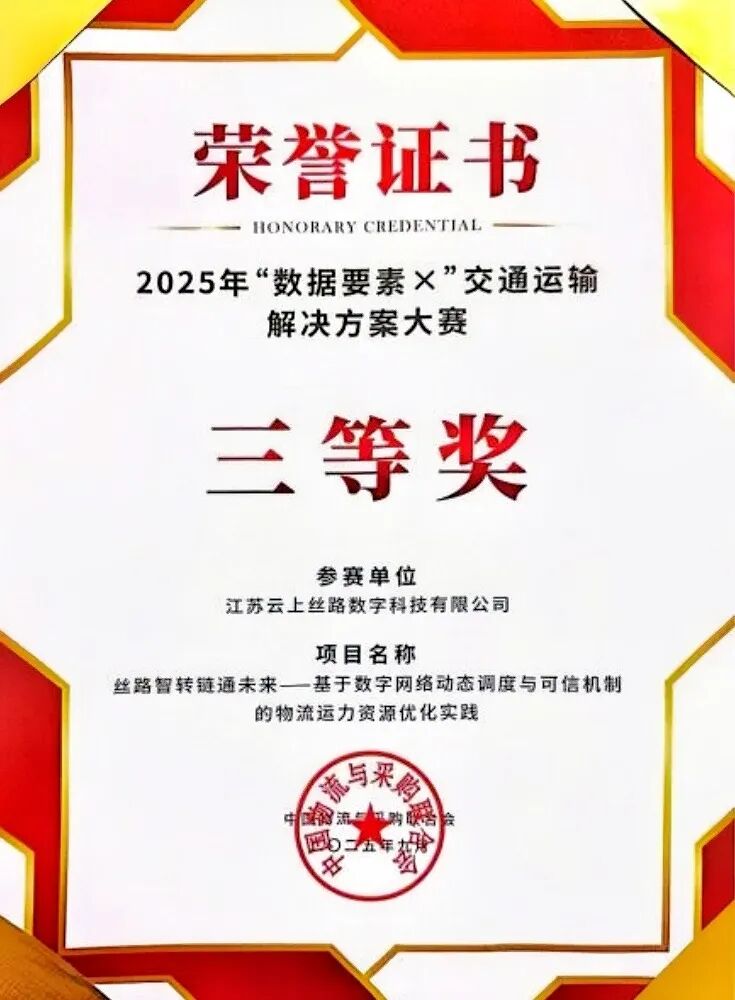 近日,2025中國物流與采購聯(lián)合會“數據要素×”交通運輸解決方案大賽全國總決賽在上海落幕,江蘇省物流產業(yè)促進會副會長單位——江蘇云上絲路數字科技有限公司憑借“絲路智轉鏈通未來——基于數字網絡動態(tài)調度與可信機制的物流運力資源優(yōu)化實踐”項目,獲大賽三等獎。